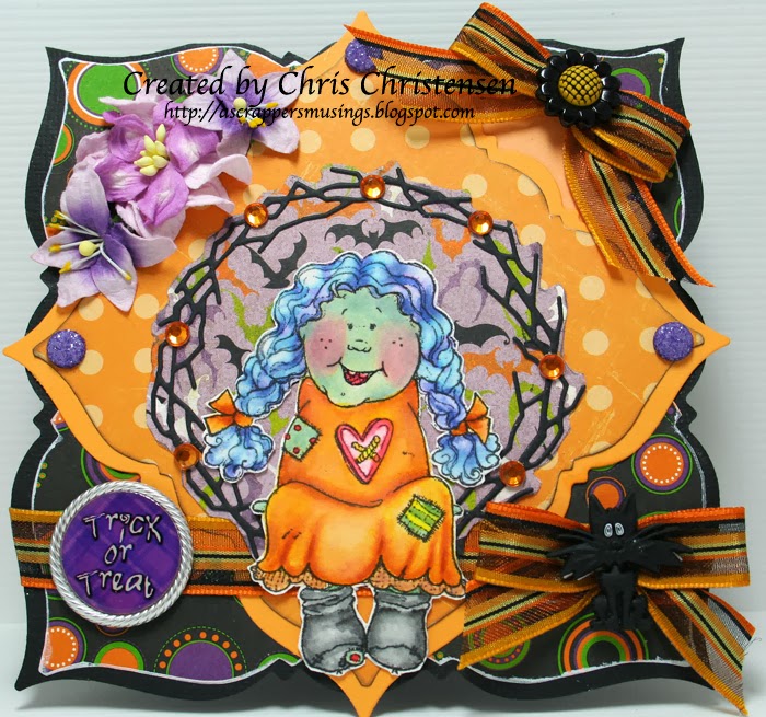 I chose to use some traditional Halloween colors - purple, orange, black. There is a hidden tag behind the mat. I added some orange rhinestones to the black grapevine wreath on which Martha sits. The purple brads are Doodlebug Sugar Coated Brads, so they sparkle. I used paper, flowers, ribbon, and embellies from my stash. I have a plastic container with all my Halloween goodies in it, so I can store and grab as needed. The wreath is by Memory Box and is called the Grapevine Wreath.